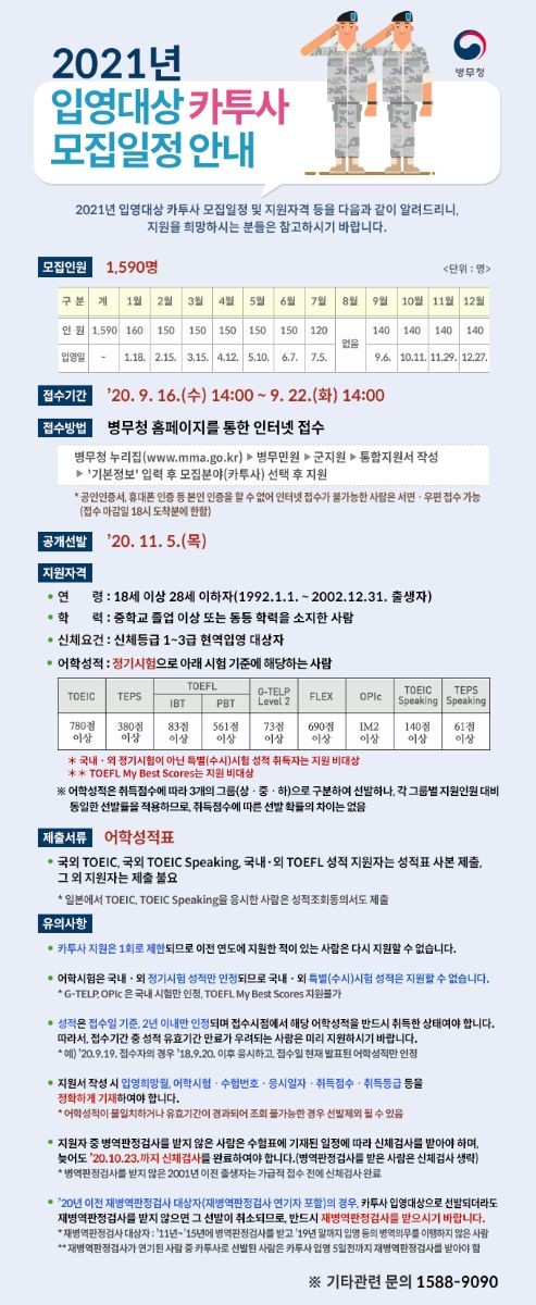 2020년 11월 5일 오후 2시, 카투사 지원자와 그 가족, 자체평가위원, 군 관계자, 사이버 보안 전문가 등이 참석한 가운데 2021년도 입영대상 카투사 1590명을 공개 ...
